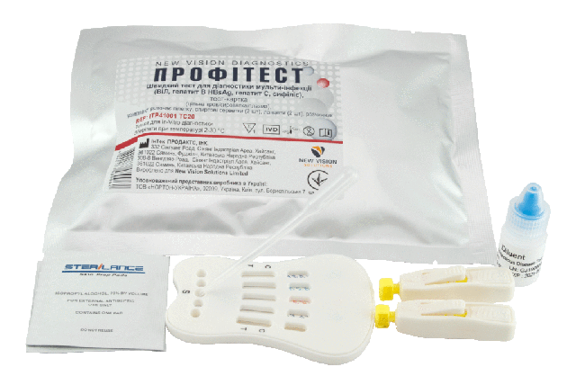 Комбінований експрес-тест для діагностики мультиінфекції (ВІЛ 1/2, гепатит В, гепатит С, силіліс) «Профітест» — це швидкий імунохроматографічний тест для якісної діагностики інфекційних захворювань у крові, сироватці або плазмі людини. Одночасно виявляє маркери до таких інфекційних захворювань: